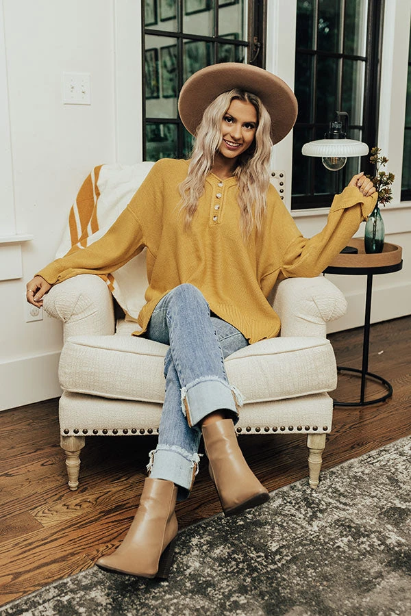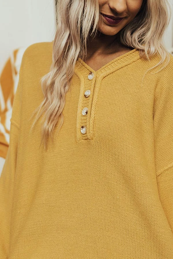 Keep it simple but stylish in our charming light mustard colored ‘Autumn Affair’ sweater featuring soft and lightweight knit material, a button up bodice with a v-cut neckline, long loose sleeves with roll tab cuffs, exposed accent seams, and a slouched silhouette that falls into a straight hemline with ribbed trim detailing!
