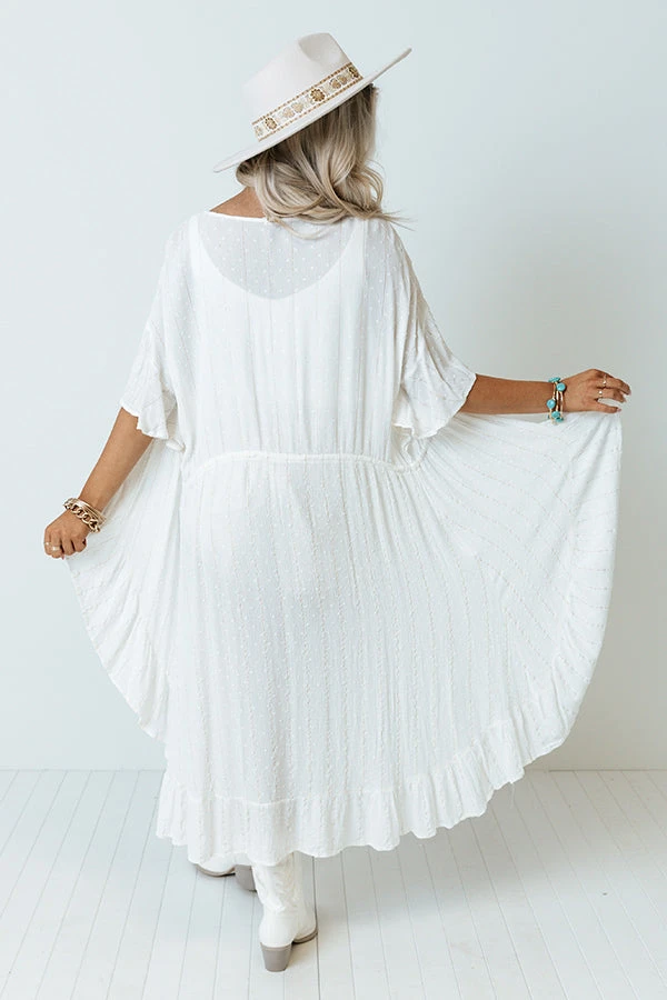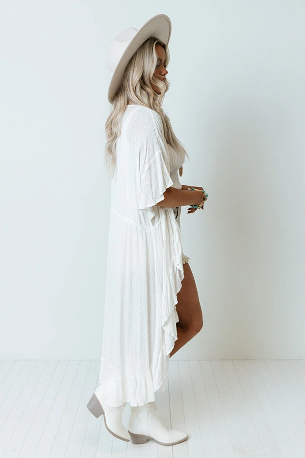 Add a boho finish to your look with our pretty white ‘Bahamas Boardwalk Duster’ featuring lightweight breezy material, a cinched tie closure at the waist, loose half sleeves with ruffled cuffs, and a draped silhouette that falls into a rounded ruffled back hemline!