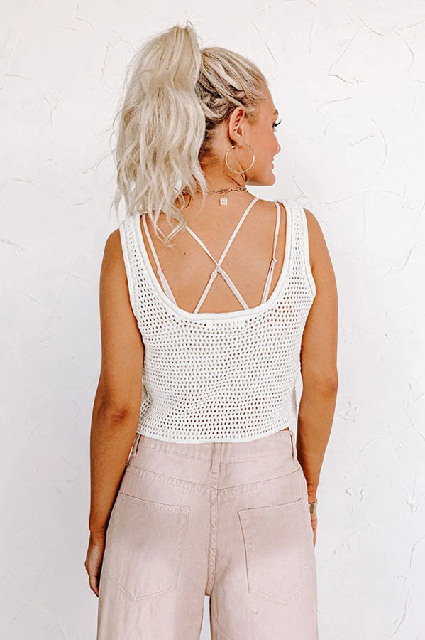 Keep cool all summer long in our trendy white ‘Beach Daydream’ top featuring ultra lightweight loose knit material, a scooped neckline, 1-inch shoulder straps, and a flattering silhouette that ends in a straight cropped hemline! For additional coverage, we recommend styling over your fave bralette!