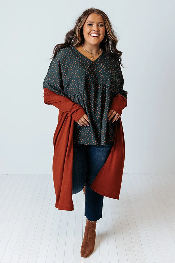 Drape yourself in style with our versatile rust colored plus size ‘Cafe On Braodway Cardigan’ featuring lightweight but warm knit material, long loose sleeves, and a draped open front silhouette that cascades into a straight mid-calf length hemline!