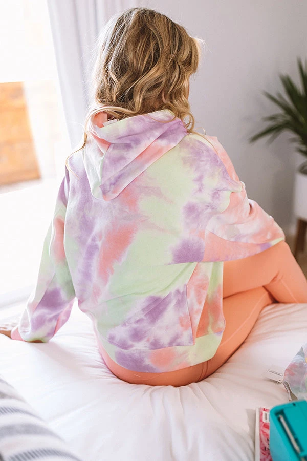 This trendy hoodie is as “cozy as they come” with its soft lightweight material, a neon green, purple, and peach hued tie dye headband, a high rounded neckline with a drawstring hooded back, a large kangaroo front pocket, long loose sleeves with fitted cuffs, and a relaxed silhouette that falls into a straight hemline! We have styled this comfy cutie with some matching leggings, but you can also wear it with some distressed white shorts, our “Relaxing Poolside Sunnies in Purple,” and “The Lela Espadrille in Coral!”