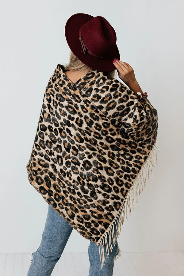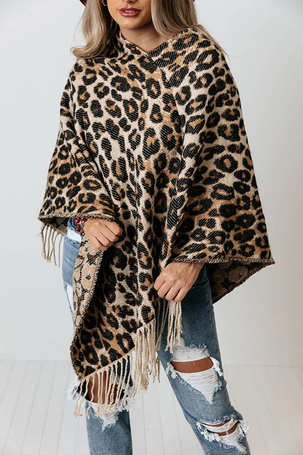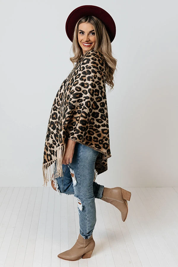 Stay oh so cozy this fall with this adorable poncho featuring soft knit material patterned with a bold black and brown leopard print, a rounded neckline, loose 3/4-length sleeves with open sides, and an ultra draped silhouette that falls into a diagonal hemline with long fringe trim detailing!