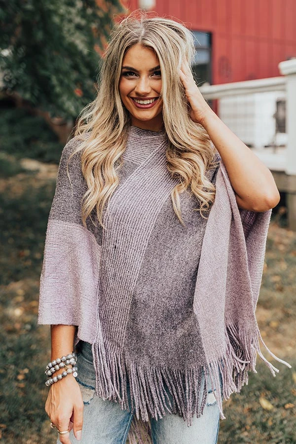Stay cozy all winter long in this adorable poncho featuring soft tight knit material with grey hued color block panels, a rounded neckline, 3/4-length open sleeves, and a draped silhouette that ends in a pointed hemline with tassel trim detailing!