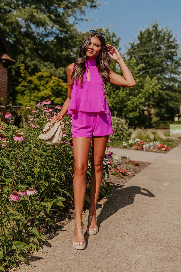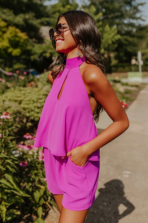 We dare you to indulge in this pretty orchid colored romper featuring lightweight material, a high neckline with a tie closure in the back, an overlay bodice with an accent teardrop cutout, a low open back, and a relaxed shorts silhouette that ends in straight upper-thigh length hemlines!