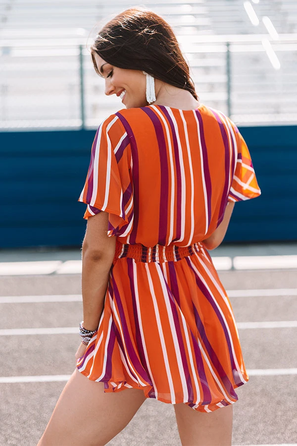 You will be full of school spirit when you wear this orange romper featuring purple and white stripes, a v-neck with a half circle cutout and front tie, short flutter sleeves, a wide waistband, and flowy shorts!