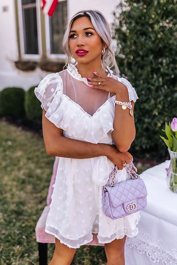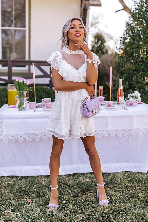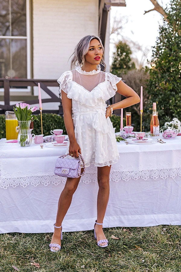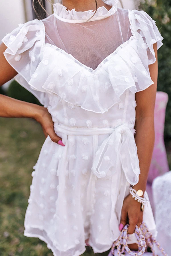 Add a unique piece to your spring wardrobe with our flirty white ‘Genuine Romance Romper’ featuring layered material with a lightweight polka dot textured tulle outer layer, a v-cut neckline on the solid under layer and a rounded ruffle hemline on the outer layer, ruffled cap sleeves that continue in a v down the bodice, a tie waistline, a keyhole accented upper back with a button closure, and a relaxed skirt silhouette that falls into a straight mid-thigh length hemline!