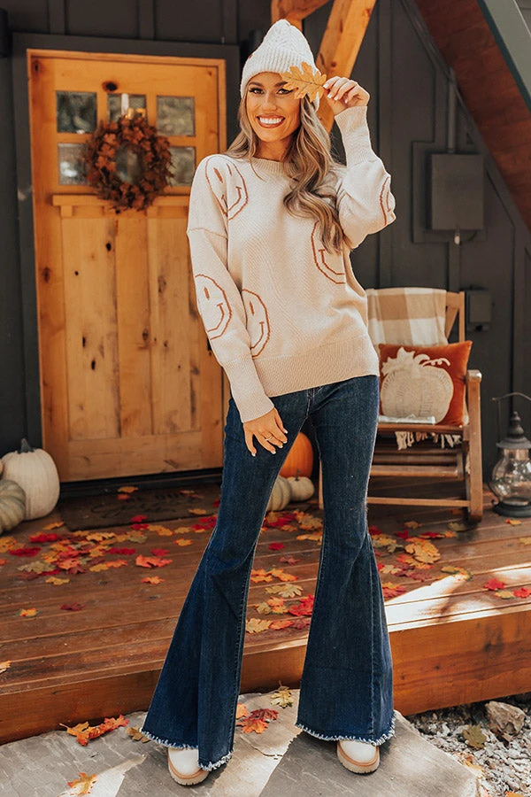 Feel your best in our ‘Happy Smiles’ lightweight sweater in birch! Features a knit material, patterned by sweet smiley faces in rust, long loose sleeves with ribbed cuffs, crew neck and hems, and a feminine silhouette with accent slits.