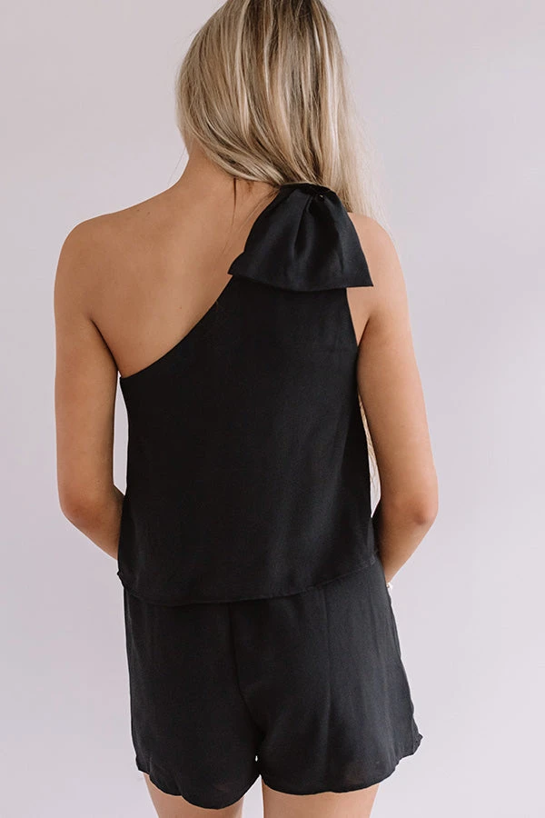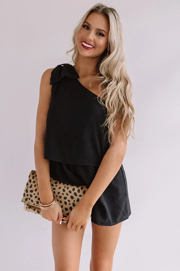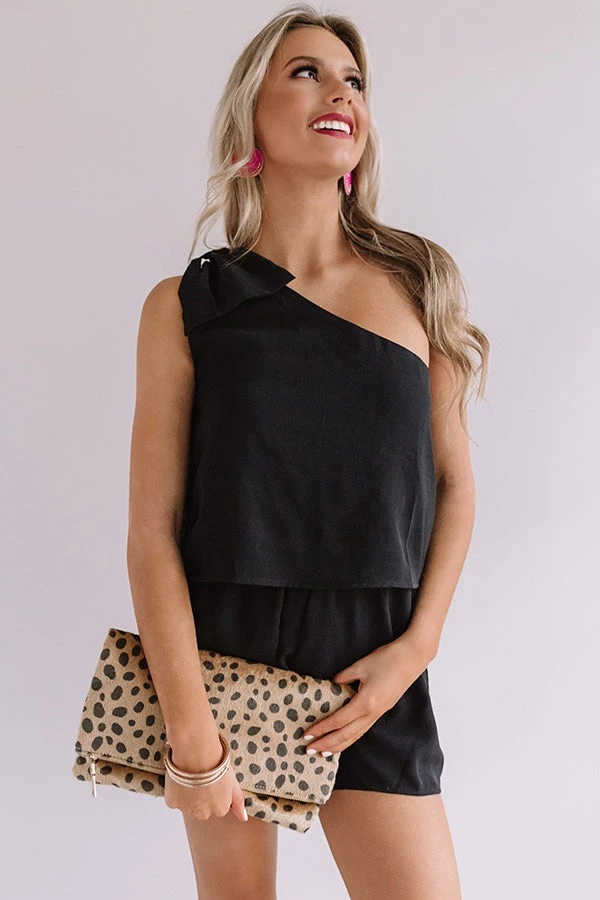 Is it just us, or is it getting “haute in here?” This adorable black romper features lightweight material, a wide shoulder strap with a large accent bow, a diagonal neckline and upper back, an overlapping bodice, and a relaxed shorts silhouette that falls into straight upper thigh length hemlines! We have styled this flirty piece with some hot pink heels, red statement earrings, and a leopard clutch, but you can glam it up even more by wearing it with our “Shimmer In Style Rhinestone Clutch in Silver” and “The Josie Wrap Up Heel!”