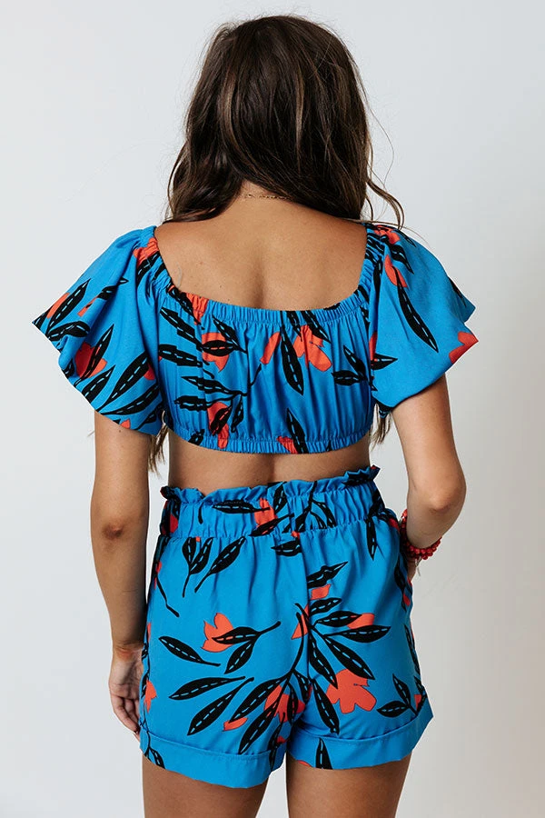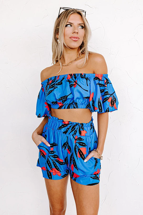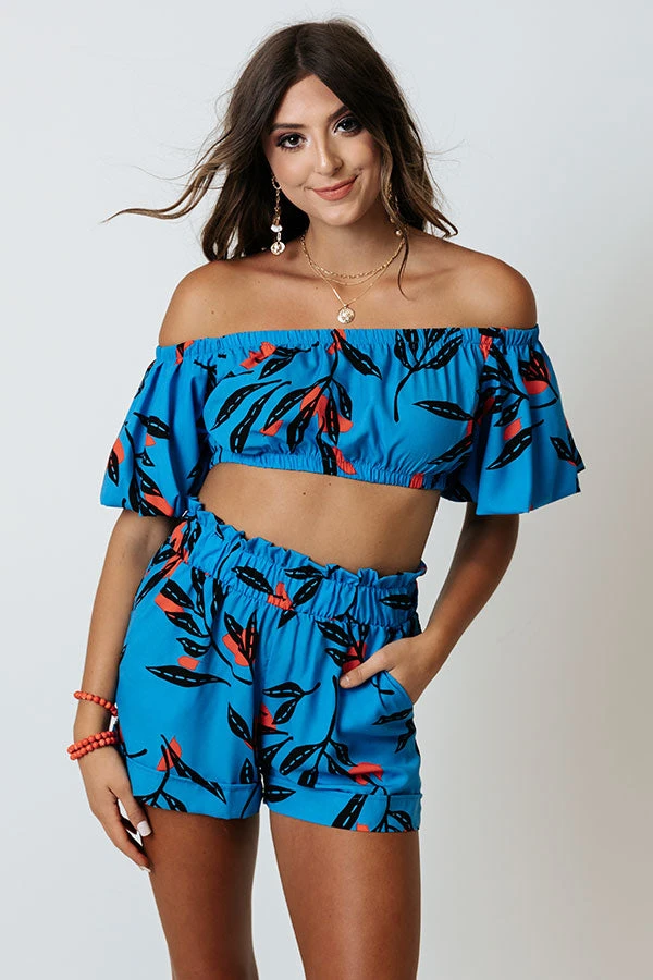 Our fave new summer piece just dropped! The ocean blue ‘Heart Of Hawaii’ top features lightweight material patterned with a black and red hued leaf print, an straight elastic off-shoulder neckline with short puff drop sleeves, and a flirty bandeau silhouette that ends in a straight cropped hemline!