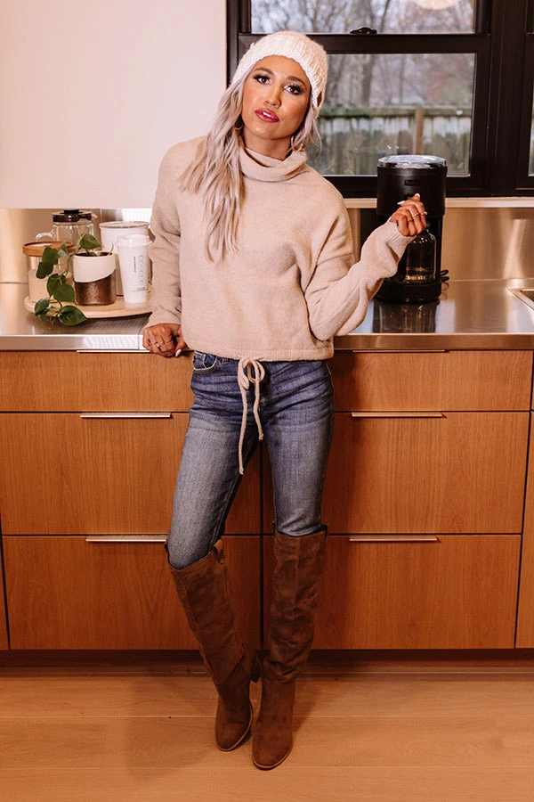 You won’t find a better layering piece for the winter than our simple but significant iced latte colored ‘Iced Coffee Kind Of Girl Sweater’ featuring lightweight but warm material, a bunched turtle neckline, long loose sleeves, ribbed trim detailing, and a slouched silhouette that ends in a straight hemline with a cinched tie closure!
