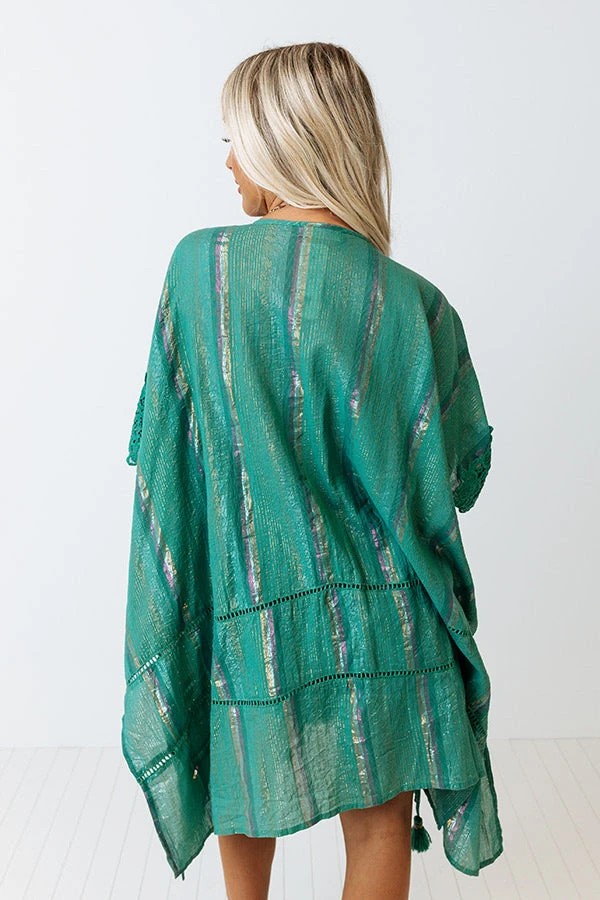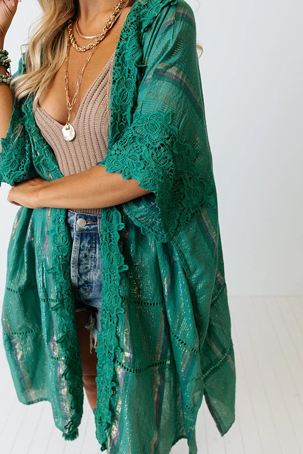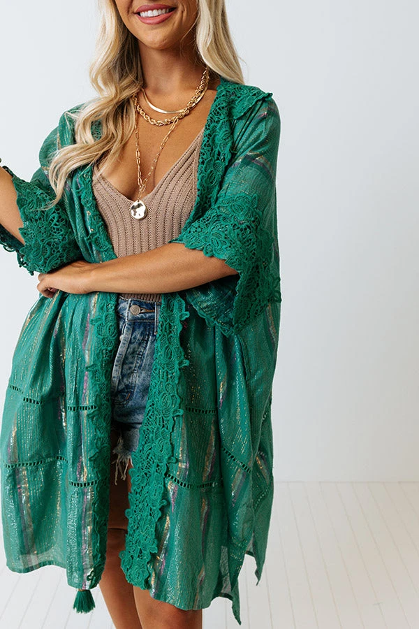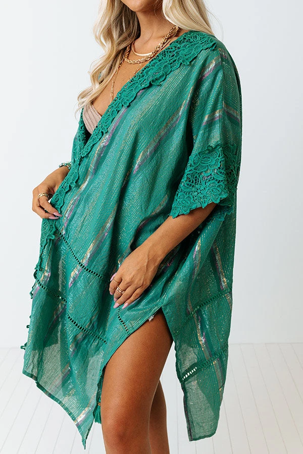 Don’t forget to pack this cute dark emerald hued overlay for your island vacay with its lightweight material, intricate crochet detailing, oversized bat wing half sleeves, tie closure front, and draped silhouette that ends in a straight mid-thigh length hemline with side slits!