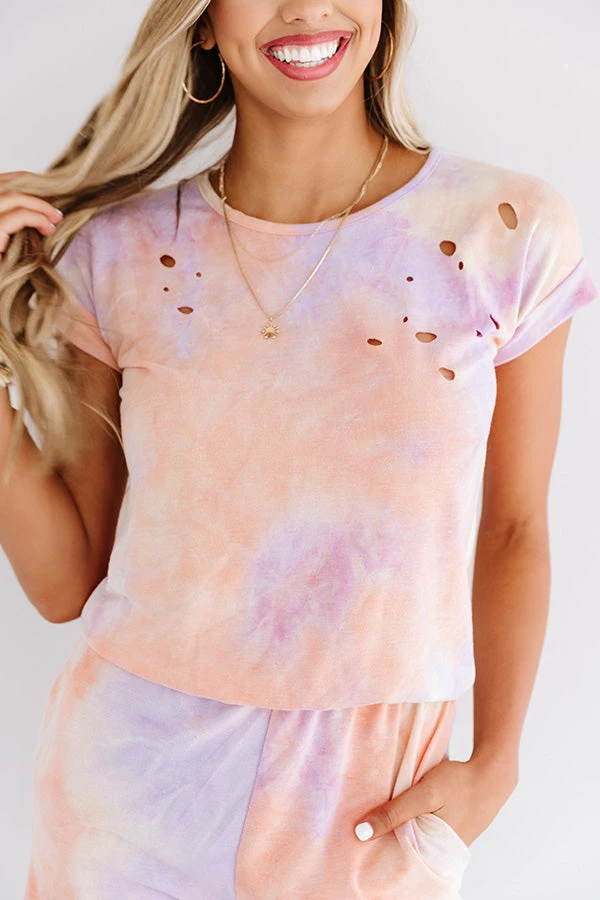 Achieve endless summer style with our trendy “It’s All Good” romper featuring soft lightweight material patterned with orange and light purple hued tie dye, a high rounded neckline, subtle distressed detailing, short loose sleeves, a cinched waistline, side pockets, a keyhole accented upper back with a button closure, and a relaxed shorts silhouette that falls into straight upper-thigh length hemlines! This colorful cutie pairs perfectly with a matching sneaker, baseball cap, and faux leather backpack, but you can also wear it with our clear strap “Candi Sandal” and our “Beachy Vbe Woven Tote!”