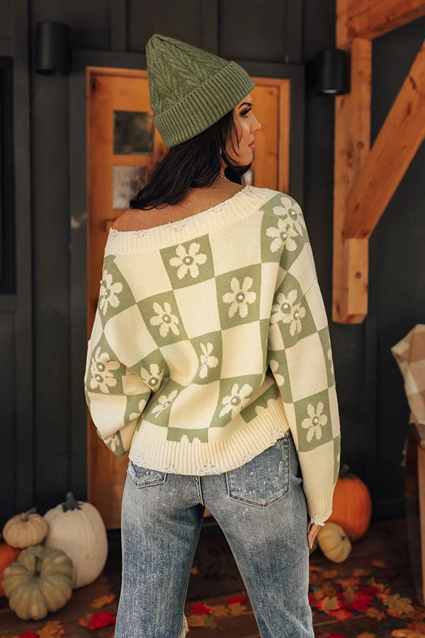 – Green and cream hued knit material with a floral checkered design and faux pearl embellishment