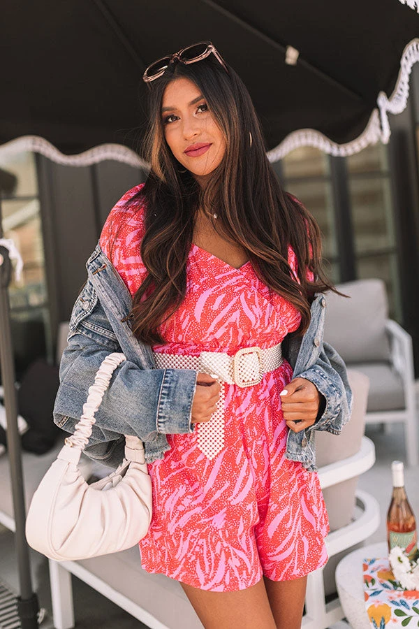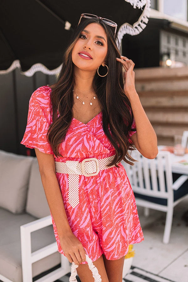 Arrive with elegance with our head turning ‘Parisian Palace Romper’ featuring lightweight flowy material, a light pink and tangerine hued zebra print with spotted detailing, a faux wrap bodice with a v-cut neckline, short loose sleeves, a wide fitted waistline, and a relaxed shorts silhouette that ends in straight upper-thigh length hemlines!