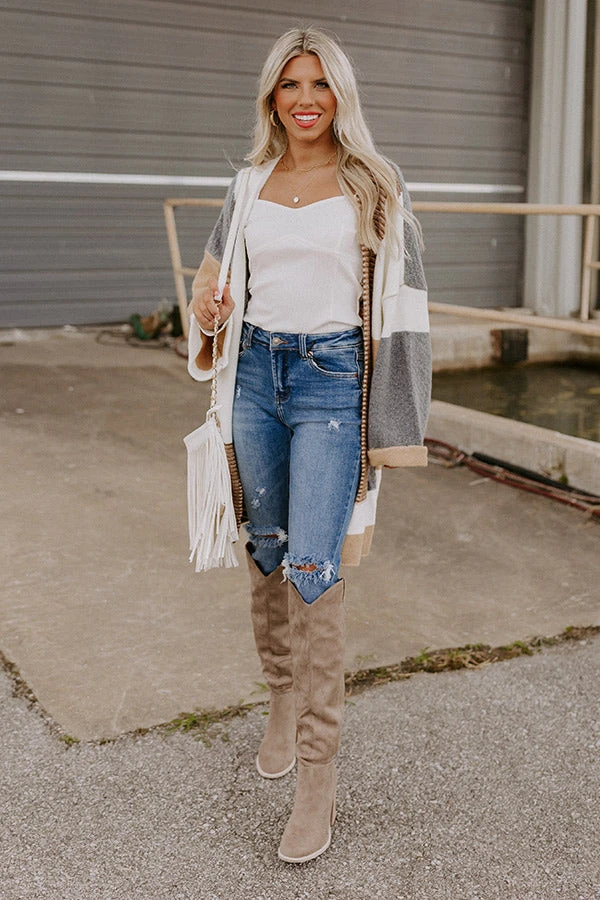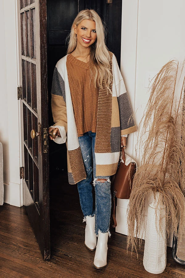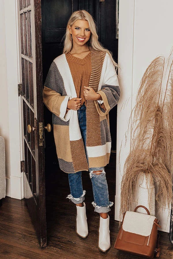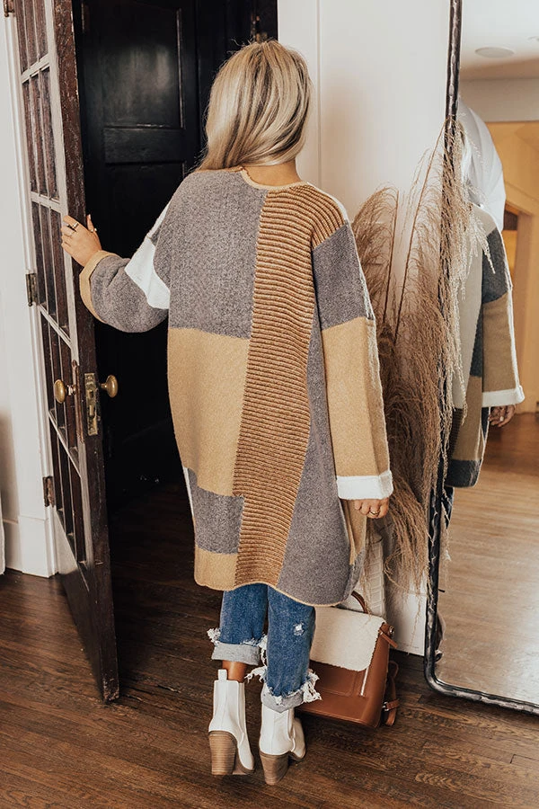 Drape yourself in style with our pretty ‘Remember To Smile Cardigan’ featuring soft knit material patterned with a chestnut, white, brown, and camel hued color block panels, long loose sleeves, and a draped open front silhouette that cascades into a straight mid-thigh length hemline!