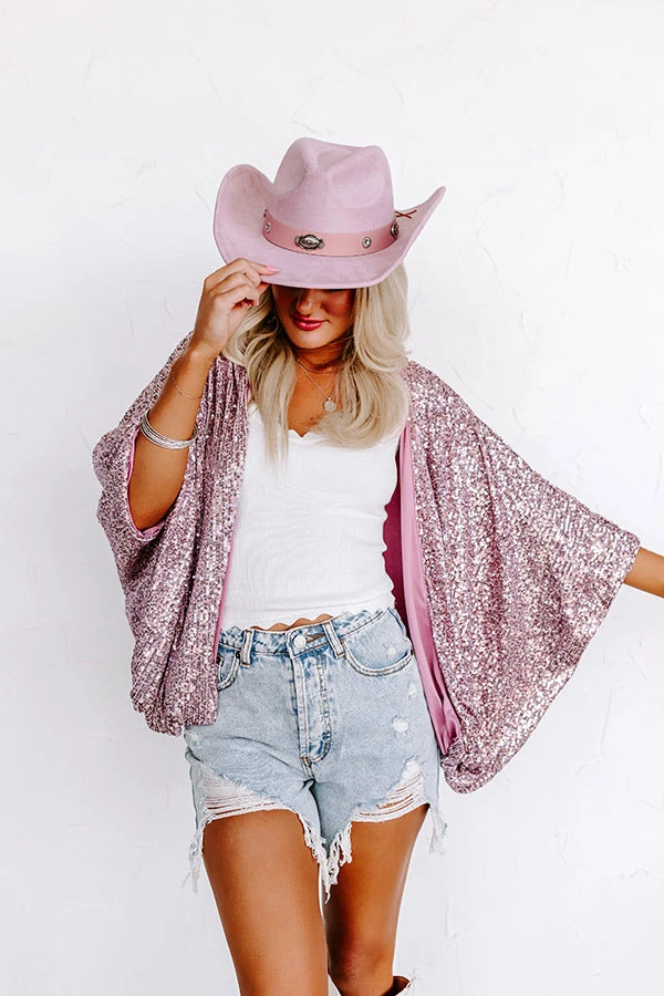 Layer up in sparkles with our head-turning ‘Ritzy Bliss’ cardigan featuring shimmering blush sequins, loose 3/4-length sleeves, and a draped open front silhouette that slouches into a straight hemline!