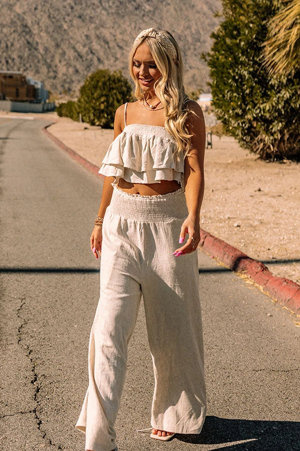 Keep cool under that summer sun in our flirty light stone hued ‘Seashells And Seychelles Crop Top’ featuring lightweight material, a straight smocked neckline with a tie closure in the back, adjustable spaghetti straps, and a tiered ruffled silhouette that ends in an uneven cropped hemline!