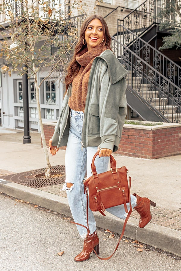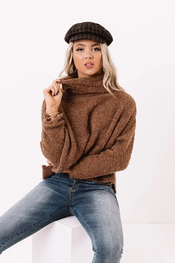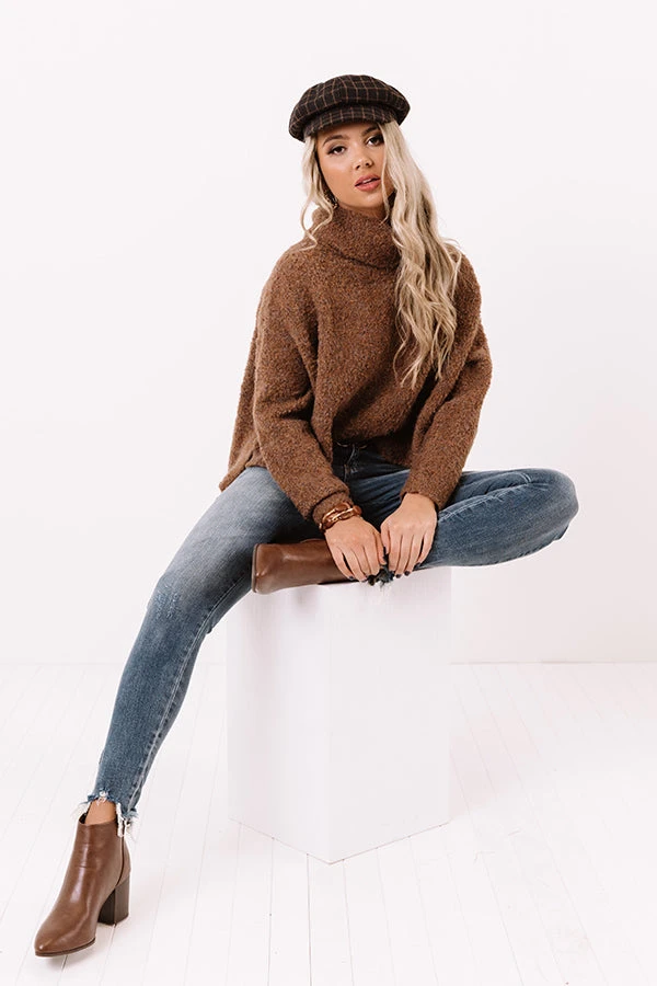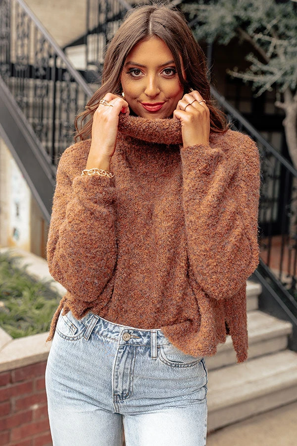 You will surrounded by snuggles when you wear this charming brown sweater featuring ultra fuzzy lightweight tight knit material, long loose sleeves with fitted cuffs, a bunched turtle neckline, and a slouched but flattering silhouette that falls into a straight cropped hemline with accent side notches!