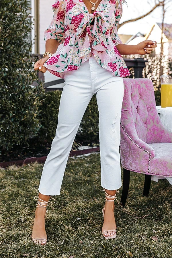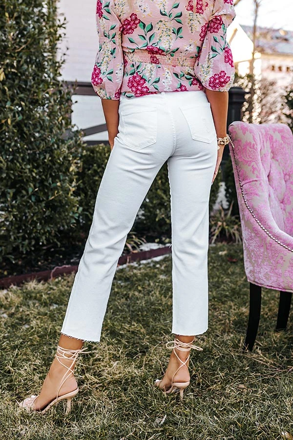 Stay chic in our timeless white ‘Auden’ pant featuring lightweight material with subtle distressed detailing, a high waistline with belt loops, a classic four pocket cut, a hidden zip fly with a button closure, and a flattering silhouette that ends in straight ankle-length hemlines!