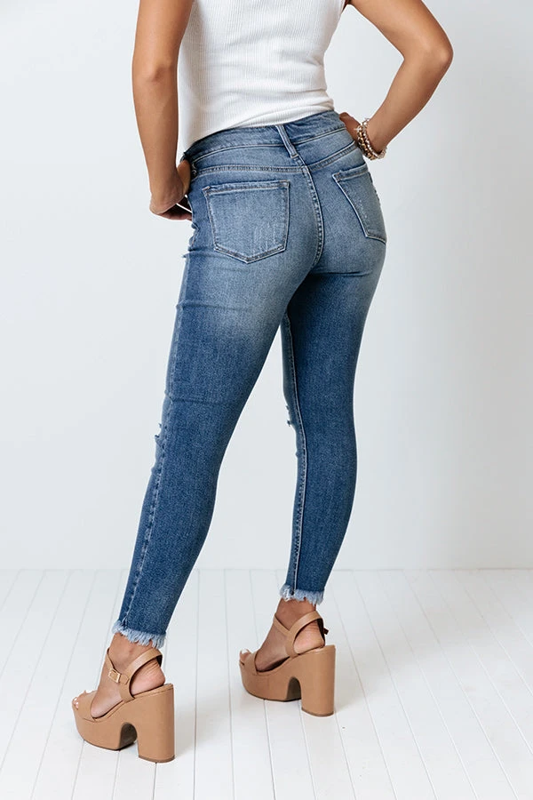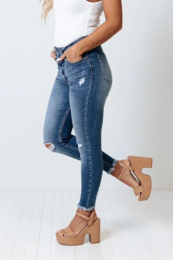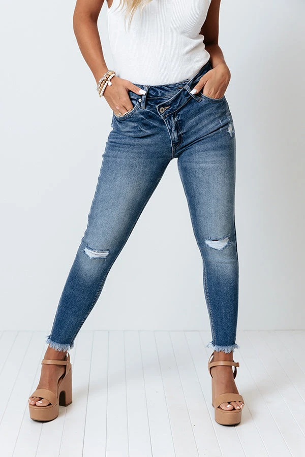 Transition from season to season effortlessly with our cute ‘Doss’ skinnies featuring lightweight medium wash denim material with subtle accent fading and distressed knee detailing, a high waistline with belt loops, a classic five pocket cut, a hidden zip fly with an asymmetrical button closure, and a flattering figure hugging silhouette that ends in frayed ankle-length hemlines!
