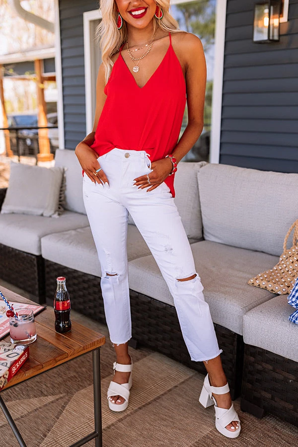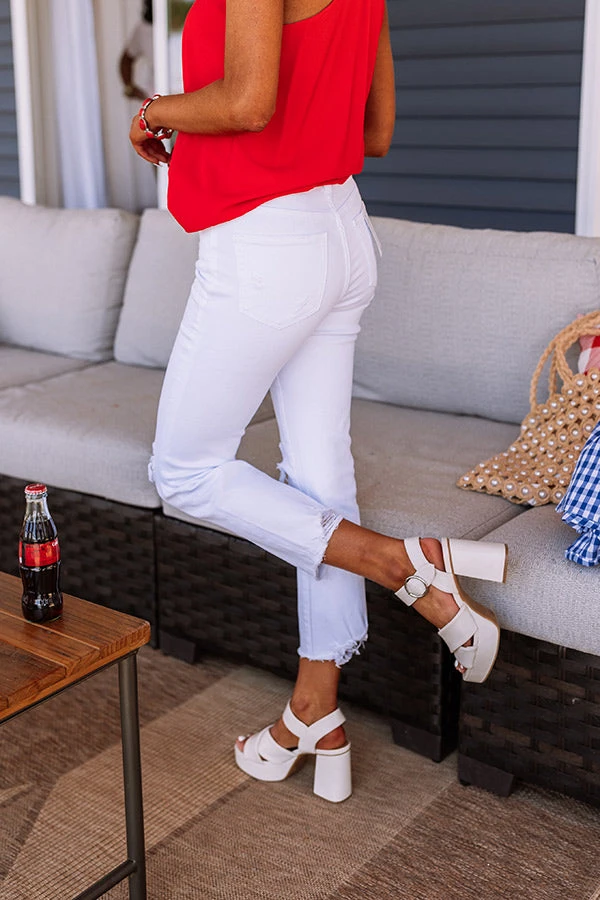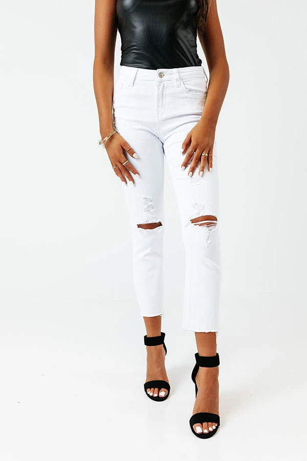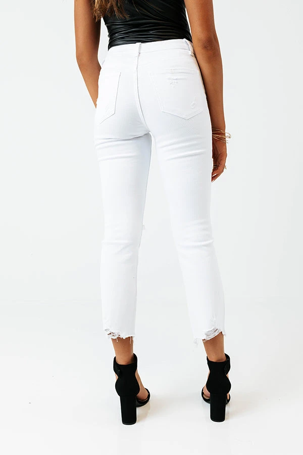You won’t find a more chic pair of denim than our white ‘Gerry’ skinny featuring lightweight material with distressed knee detailing, a high waistline with belt loops, a classic four-pocket cut, a hidden zip fly with a button closure, and a flattering figure hugging silhouette that ends in ankle-length hemlines!