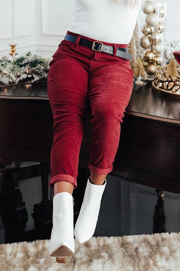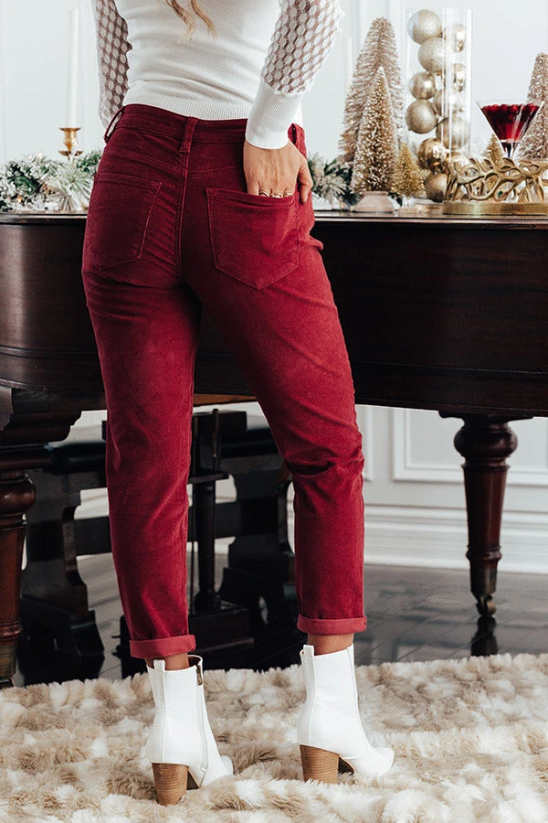 Strut into the holidays in style with our fashionable wine hued ‘Hannon’ skinny featuring lightweight corduroy material, a midrise waistline with belt loops, four pocket cuts, a hidden zip fly with a button closure, and a flattering relaxed silhouette that falls into straight ankle-length hemlines that can be cuffed!