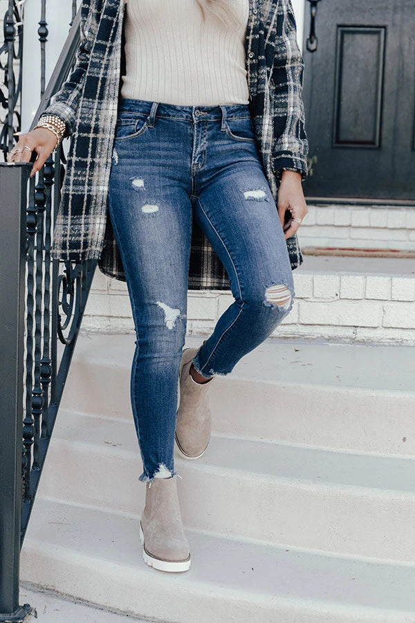 Life is more than just fitting into your jeans, but we believe you will LOVE the look and feel of our adorable “Jenson” skinnies featuring lightweight dark wash denim material with distressed detailing and subtle accent fading, a midrise waistline with belt loops, four pocket cuts, a hidden zip fly with a button closure, and a form fitting silhouette that falls into ultra frayed ankle-length hemlines!