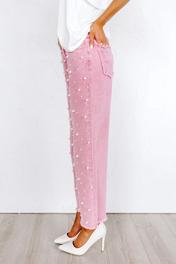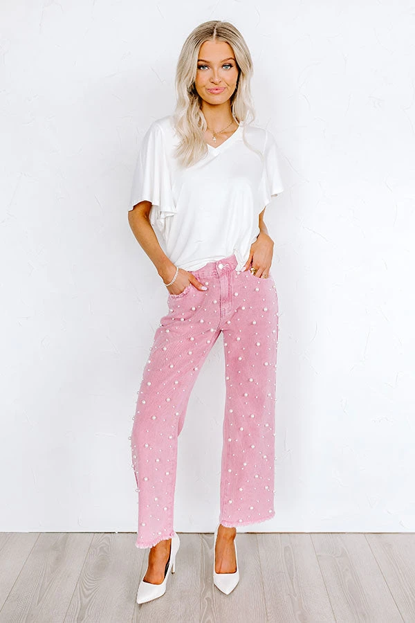 – Non-stretch denim material with faux pearl embellishment on front