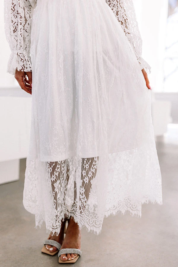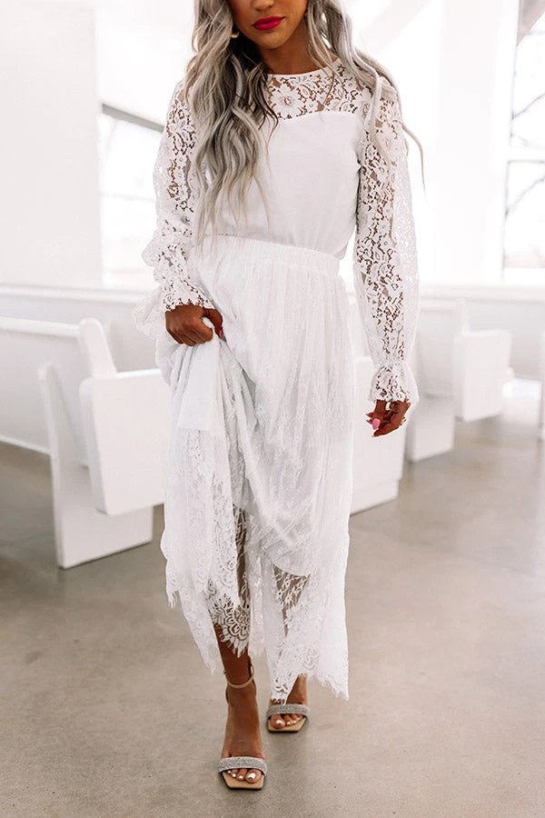 Keep your weeing style versatile with our white ‘Misi’ midi skirt featuring lightweight intricate semi-sheer lace material with a solid slip underneath, an elastic waistline, and a relaxed silhouette that cascades into an uneven mid-calf length hemline!