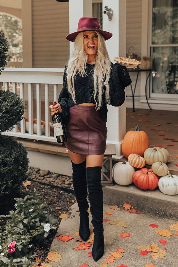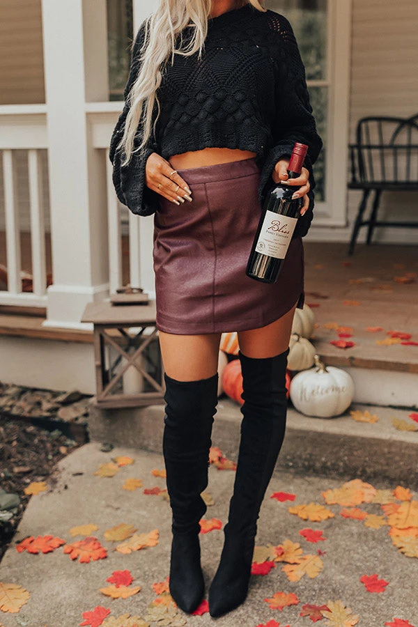 Heads are guaranteed to turn your way when you complete your look with our edgy wine colored ‘Tobi’ skirt featuring sleek faux leather material, a wide waistband, and a flattering silhouette that ends in a rounded upper-thigh length hemline!
