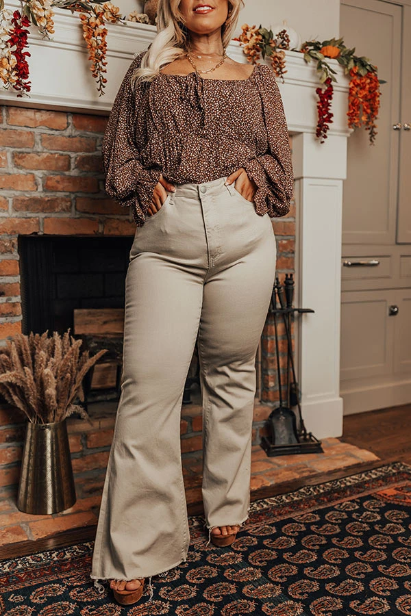 From boho to chic, our West High Waist Flares are sure to be this season’s staple! They feature a neutral hued color, soft stretchy fabric, a zipper and button closure and have an unfinished hem line.