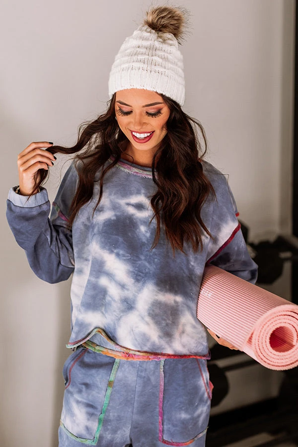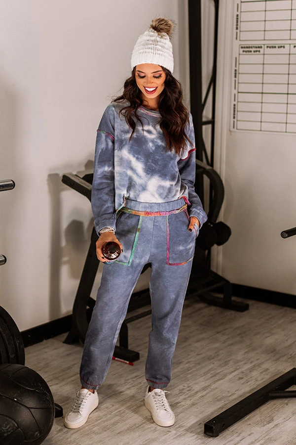Our fave travel tip is to wear an adorable matching set! This trendy sweatshirt features soft lightweight mineral wash material patterned with blue tie dye, rainbow accent seams, a high rounded neckline, long loose sleeves, and a slouched silhouette that ends in a straight hemline!