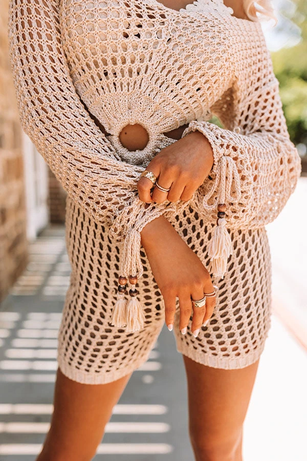 The perfect vacay piece, our cute light beige hued ‘Yacht Trip’ romper features ultra lightweight crochet material, a scooped neckline, long loose sleeves with tie closure cuffs, accent side cutouts with a tie closure in the back, and a flattering shorts silhouette that ends in straight upper-thigh length hemlines!